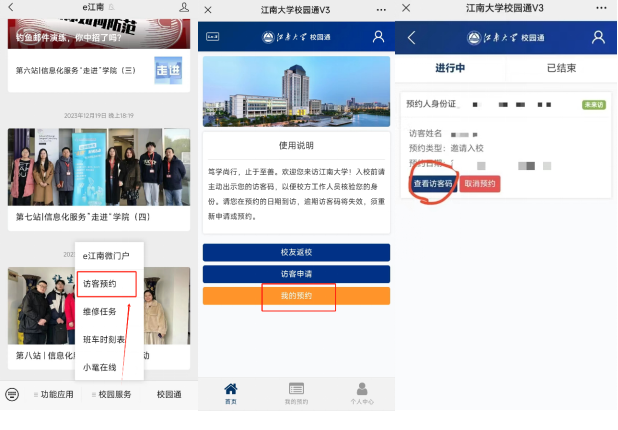 考核期间考生仅限学校东大门进出。考生进校需采用“访客预约”入校(手机关注“e江南”微信公众号,点击屏幕下方“校园服务”中的“访客预约”),如下图所示: