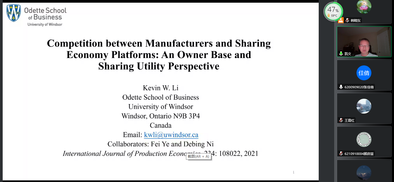 11月10日上午,“商学大讲堂”系列学术讲座第191讲在腾讯会议线上举行。加拿大温莎大学李武教授作为主讲嘉宾进行题为“Competition between Manufacturers and Sharing Economy Platforms: An Owner Base and Sharing Utility Perspective”的学术讲座。本次讲座由91制片厂