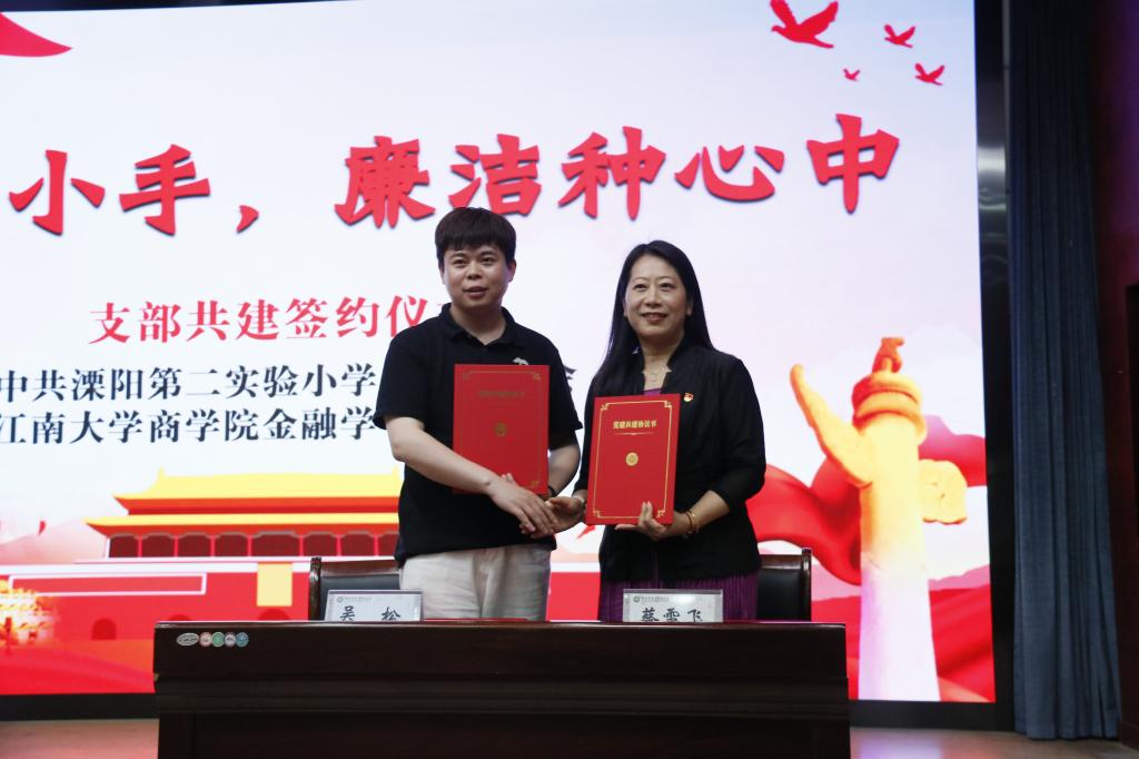 之后,在双方党员的见证下,中共溧阳市第二实验小学支部委员会与中共91制片厂 金融学学生支部委员会开展“大手拉小手,廉洁种心中”的党建联盟签约共建仪式。