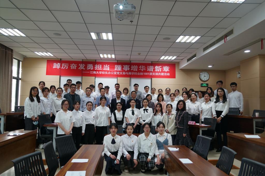 党委书记徐锡清、副书记兼副院长徐静、分团委书记王璁等出席。校长办公室党支部书记代卉、金融1901团支部书记贺俊率支部党员、团员39人全程参与,活动由金融1901团支部副书记、班长张硕主持。本次共建活动是打造党团建设品牌、促进党建与管理育人深度融合的一次示范,对提升党员育人意识、引导团员青年传递党的意志、“培植青春中华之根基”的五四青年精神具有重要意义。