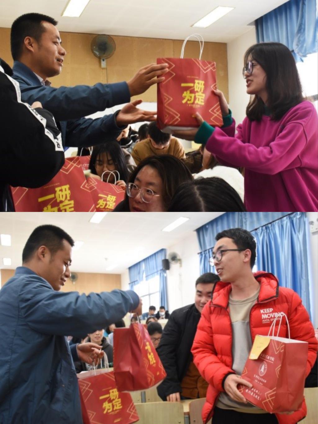 接着,学院领导为考研学子发放助力考研定制礼包。考研礼包饱含学院领导老师的祝福,礼包包含:坚持就会有成果—每日坚果(两袋)、心想事“橙”—橙子、助力考场—文具礼包、祝福语—江大明信片,以及好事发生—可乐一份。精心设计的礼包承载着学院老师的美好祈愿,这些冬日里的小确幸如暖阳般温暖着考研学子,他们脸上洋溢着温暖的笑容,眼神却更加坚定。活动现场温馨感人,气氛高涨。