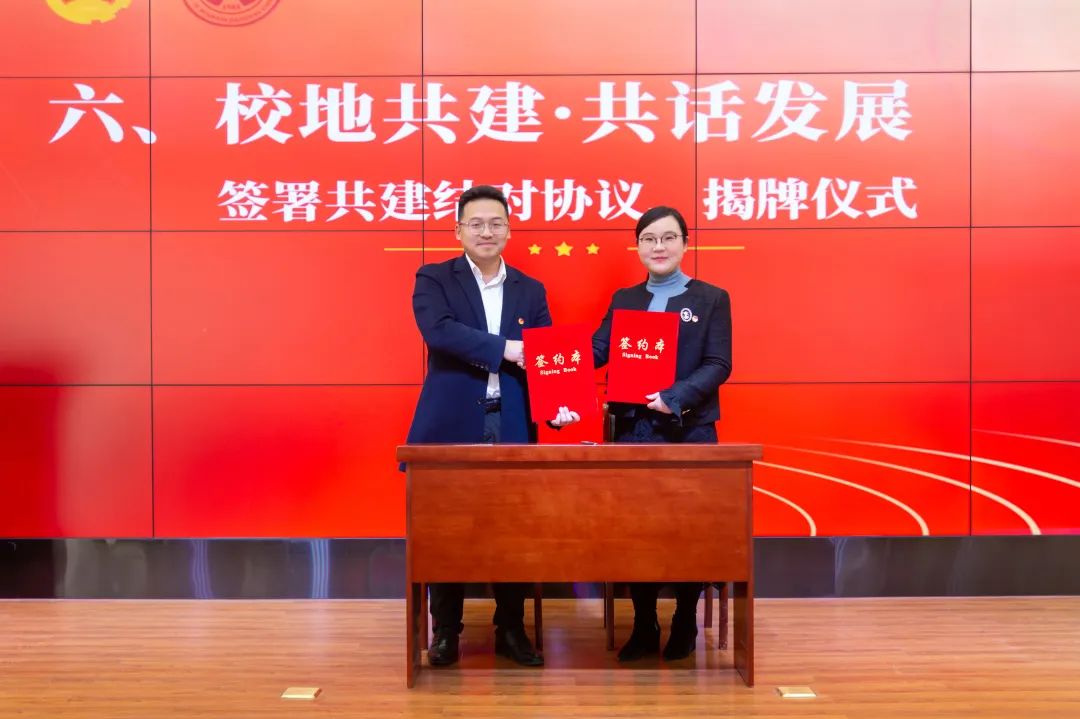 分团委签署大学生红色教育实践基地共建结对协议。丁一鸣与王璁为“红色教育实践基地”揭牌。