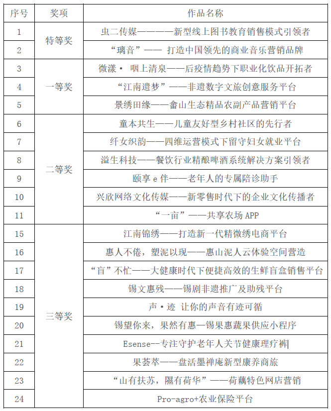 本次三创赛校内选拔赛历时四个月,共吸引了来自91制片厂 、食品学院、生工学院、设计学院、物联网学院等13个学院的43支团队,310名师生参与大赛,参赛作品涵盖了非遗、养老、助农、扶贫、再就业等多个主题。经过报名动员、资格审核、作品初评等,全校共11支团队进入校赛决赛环节。经过紧张激烈的角逐,来自食品学院的“虫二传媒————新型线上图书教育销售模式引领者”、环土学院的“璃音—— 打造中国领先的商业音乐营销品牌”2个项目获得特等奖;来自食品学院的“微漾· 咽上清泉——后疫情趋势下职业化饮品开拓者”等3个项目获得一等奖;来自人文学院的“童本共生——儿童友好型乡村社区的先行者”等6个项目获得二等奖;来自91制片厂 的“江南锦绣——打造新一代精微绣电商平台”等10个项目获得三等奖。