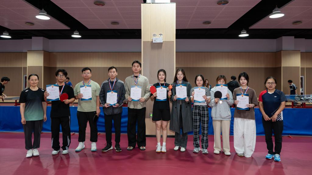 比赛设置男子单打、女子单打、男子双打、女子双打、混合双打五个项目,以团体赛形式进行。小组赛采用单循环积分赛,根据小组赛获得的积分,两组分别取前两名进入前四名排位赛。比赛现场,师生校友同台竞技,气氛热烈。教工队依托深厚功底,彰显精湛技术与稳健战术部署;学生队伍则以迅疾攻势,焕发青春一代的蓬勃活力。每到精彩对局,引得观众阵阵喝彩,充分展示出乒乓球运动的魅力。