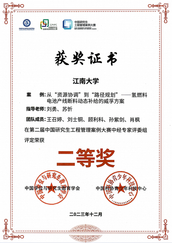 12月9-10日,第二届中国研究生工程管理案例大赛全国总决赛在清华大学落下帷幕。由我校“江南顶梁柱”团队(指导老师:刘勇、苏忻 团队成员:王召婷、刘士铜、顾利科、孙紫剑、肖枫)合作撰写的案例——《从“资源协调”到“路径规划”——氢燃料电池产线断料动态补给的威孚方案》,从全国 133 家研究生培养单位提交的270 个有效案例中脱颖而出,以总得分第四名荣获全国总决赛二等奖。