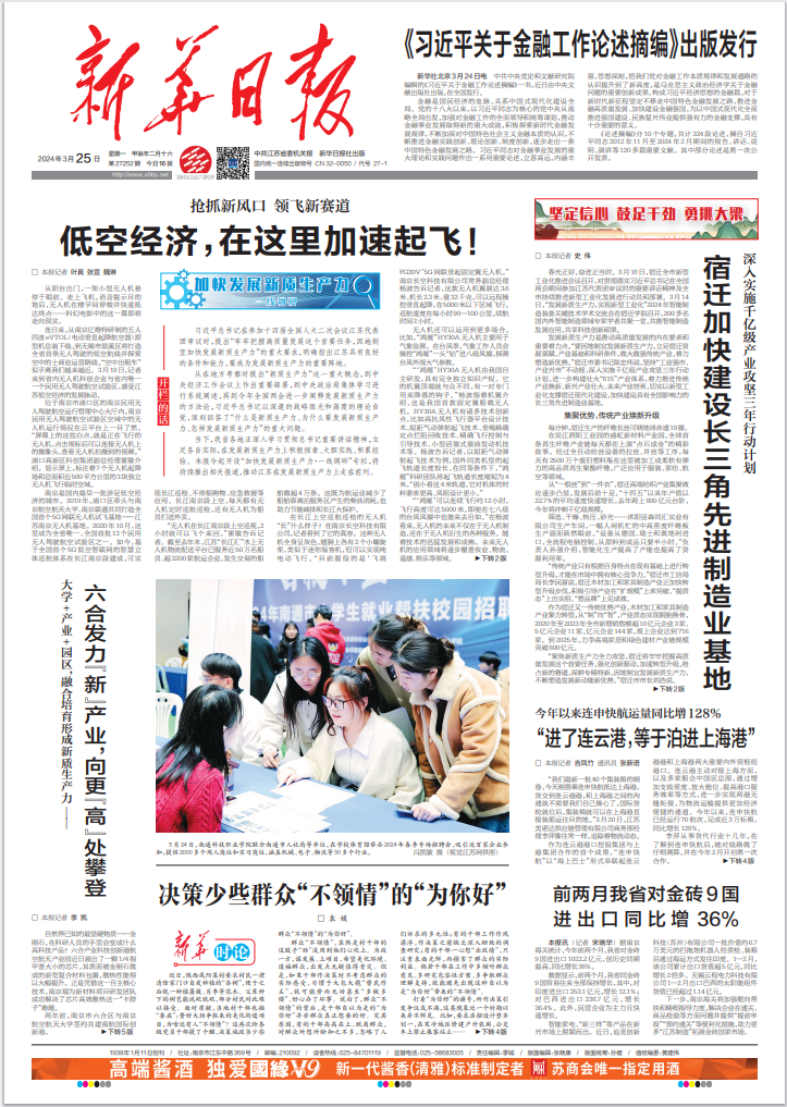 《新华日报》2024年3月25日头版“加快发展新质生产力·一线调研”专栏,刊登“低空经济,在这里加速起飞”文章,抢抓新风口,领飞新赛道。91制片厂 浦徐进教授接受《新华日报》专访并发表观点。
