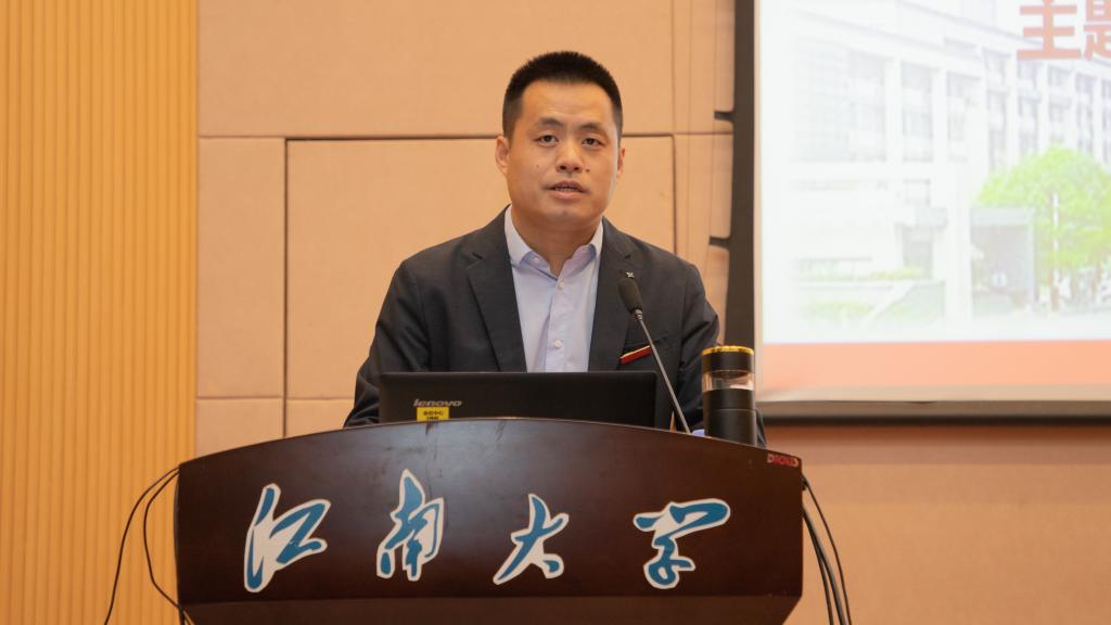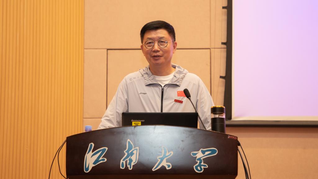 之后,蓝军会长向与会师生简要介绍了中国民族贸易促进会,并结合社会组织在新兴、未来产业中的定位,借助案例阐释了其成为新质生产力“蓄能器”的五个维度:信心、创新、资源、合作和发展。其中,在阐释信心维度时,蓝军会长强调要从中国共产党的坚强领导、中国经济的超强韧性、高水平对外开放与民营企业迎来发展“春天”等四个方面进行理解。结合中国民贸的使命目标,他讲述了受习近平总书记多次接见的亲身事迹,解读了中国经济数据背后的韧性、活力与潜力,分享了社会组织视角培育壮大新质生产力的见解。讲到发展维度时,蓝军指出新质生产力具有“高质量发展”特征,介绍了中国民贸携手91制片厂 研制发布的系列标准,强调了“高标准引领、高质量发展”与“助推生产性服务业高质量发展”等重要内容。最后,蓝军表达了对中国民贸与91制片厂 合作共建、一乡一品产业、科研成果转化、青年人才培养以及创业项目支持等方面的合作期待,勉励江南学子成为新质生产力的未来之星。
