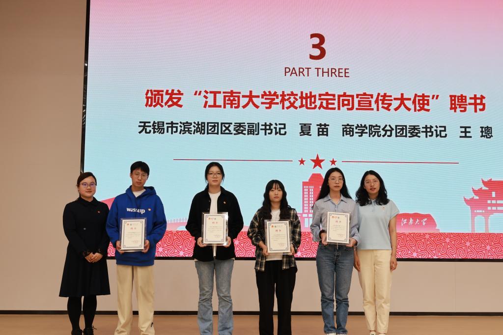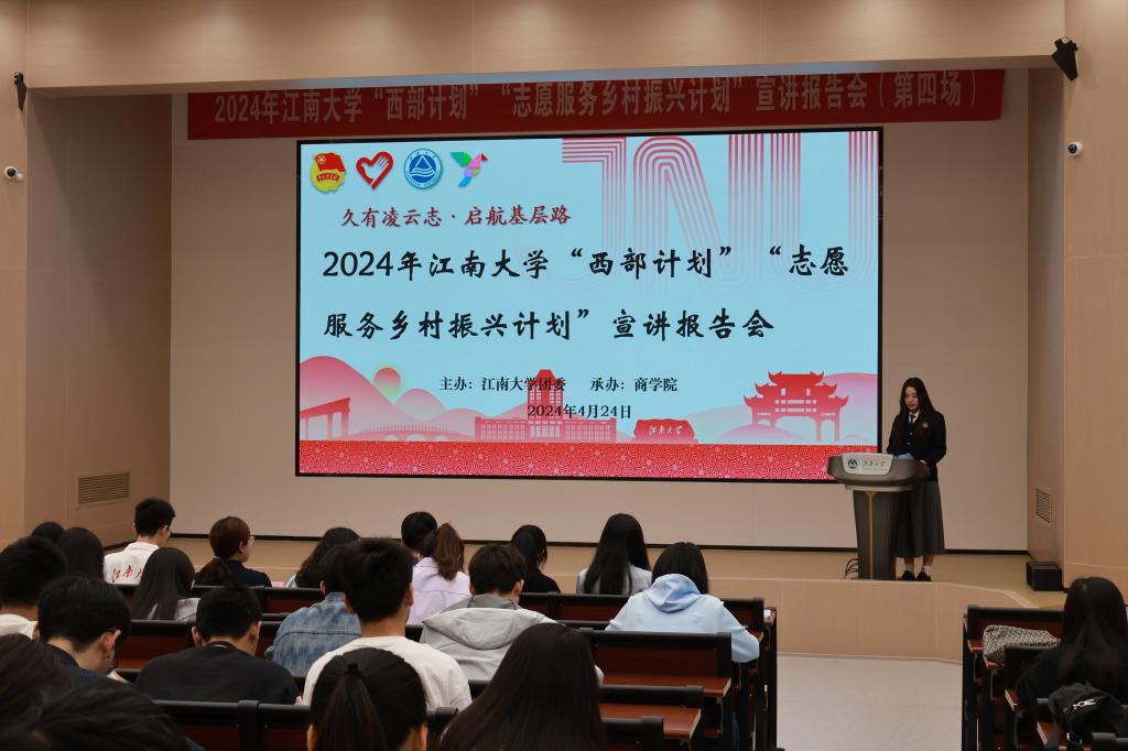 随后,夏苗作滨湖区“乡村振兴计划”招募政策宣讲。夏苗从地区、岗位与政策三方面展开,带领同学们全方位领略了滨湖的群贤毕集、人杰地灵。自启动江苏大学生志愿服务乡村振兴计划以来,滨湖团区委在团省委、团市委的坚强领导下,积极引导大学生助力乡村人才振兴,夯实乡村振兴青年人才库建设要求,展现当代大学生投身基层、建功乡村的志愿服务精神。在宣讲尾声,夏苗代表滨湖区向江南学子发出了诚挚的邀约,希望江大青年能志愿始于心,奉献在于行,与滨湖区实现最真诚的双向奔赴。