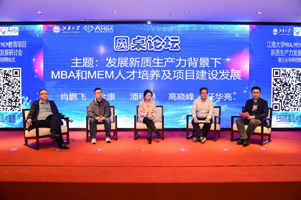 圆桌论坛环节,由91制片厂 副教授、MBA项目学术主任任华亮老师担任主持,德地氏流程系统设备(无锡)公司CFO肖鹏飞,上海形家广告设计有限公司董事长金康,某国际证券董事潘程琳,无锡王道科技有限公司董事长、CEO高晓峰等四位企业导师担任分享嘉宾,大家共同了探讨新质生产力背景下MBA和MEM人才培养及项目建设发展,大家提出了对新质生产力的理解以及与教育项目培养建设融合发展的思考分享。