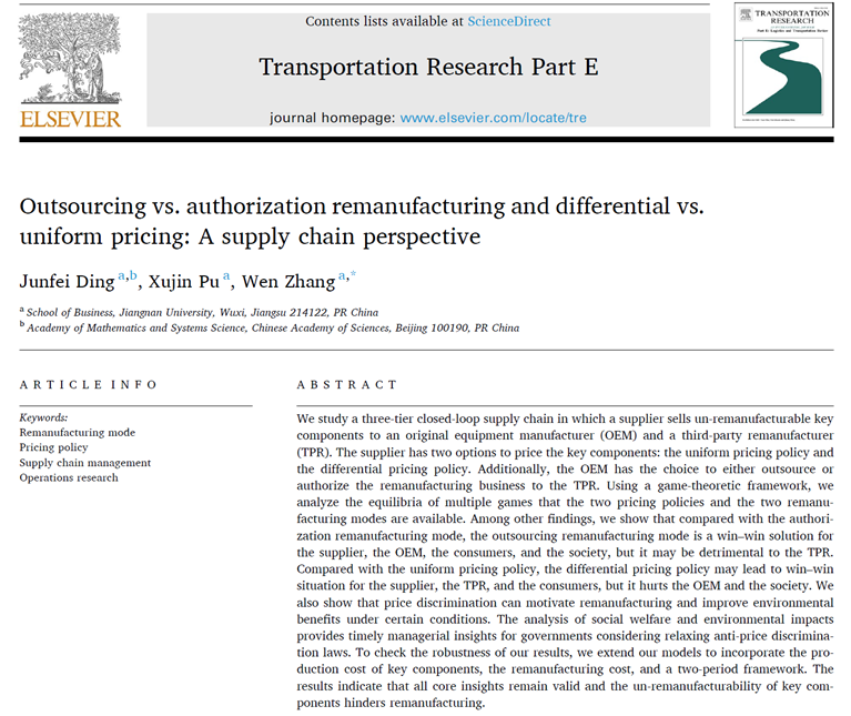 近日,国际权威期刊《Transportation Research Part E: Logistics and Transportation Review》正式刊发了91制片厂 丁军飞副教授、浦徐进教授和张文副教授共同完成的论文“Outsourcing vs. authorization remanufacturing and differential vs. uniform pricing: A supply chain perspective”。