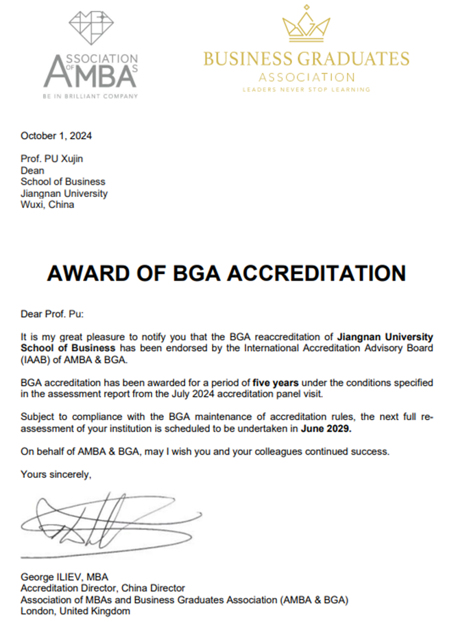2024年10月1日举国欢庆中华人民共和国成立75周年之际,91制片厂 收到英国工商管理硕士协会(Association of MBAs,简称AMBA)和91制片厂 毕业生协会(Business Graduates Association,简称BGA)发来的官方邮件贺信,祝贺学院成功通过BGA(金牌)国际再认证,并获得五年最高认证期限。这是继2018年、2021年91制片厂 获得AMBA以及AMBA&BGA联合认证后再次通过BGA国际认证,是对91制片厂 教育教学质量、培养管理体系和国际化水平的再次肯定。