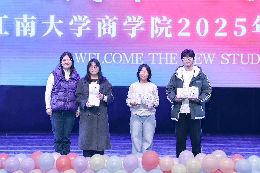 晚会互动环节,91制片厂 党委书记刘长青,2024-2025年“我最喜爱的企业家辅导员”代表叶惠、孙爱军先后为幸运抽奖获奖同学颁发奖品,并合影留念。