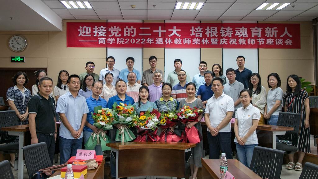 教师节传承活动,老中青教师齐聚一堂座谈交流已经成为学院文化和教育精神的传承仪式。他逐一回顾了八位退休教师与学院共同发展的感人往事,代表学院党政工,向全体老师致以教师节诚挚的问候和祝福,致敬一代代商院人接续努力和辛勤付出。他指出,“青蓝结对”是学院教师专业发展的重要力量源泉,制度实施六年来已成功培养了一支教学强、科研精的教师队伍,他希望结对的师徒在相互学习、相互启迪、相互分享中实现相互促进与共同成长。他强调,在学院未来的发展中,要进一步固化帮助青年教师快速成长的“青蓝工程”,充分发挥“青年博士教工党支部”的模范引领作用,持续打造以“尚学质量工程”为抓手的“骨干教师推动工程”,发挥教师育人工作室作用,打造“名师引领工程”,组建有一定影响力的教学团队。他希望广大教师坚持立德树人根本任务和改革发展第一要务,心怀“国之大者”,牢记“为党育人、为国育才”的教育初心,在全面建设社会主义现代化国家的新征程中勇担培育时代新人的历史使命,以昂扬向上的精神面貌和立德树人的扎实行动,迎接党的二十大胜利召开。