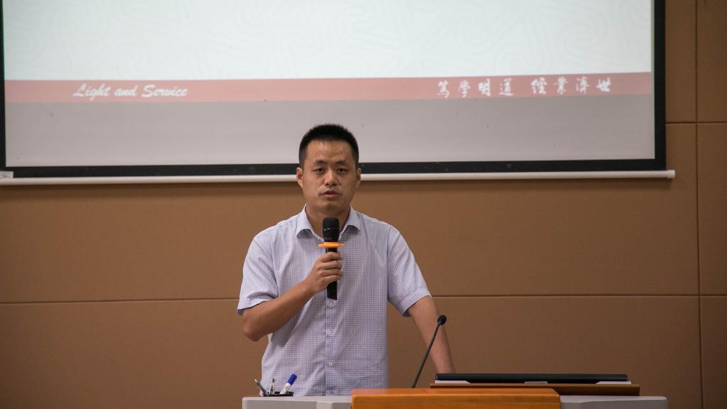 随后,江苏省普通高校本专科优秀毕业论文一等奖指导教师施震凯作为青年教师代表进行发言。他围绕“如何成为一名合格的高校教师”这一主题,从责任感、紧迫感、自律性三个面分享了自身的感受。他希望新入职的年轻教师能本着对学生成才、家长期望、自身发展的高度责任感,以时不我待的发展紧迫感,加强自律与自控,不断提升教学科研能力,努力成长为一名优秀的高校教师。