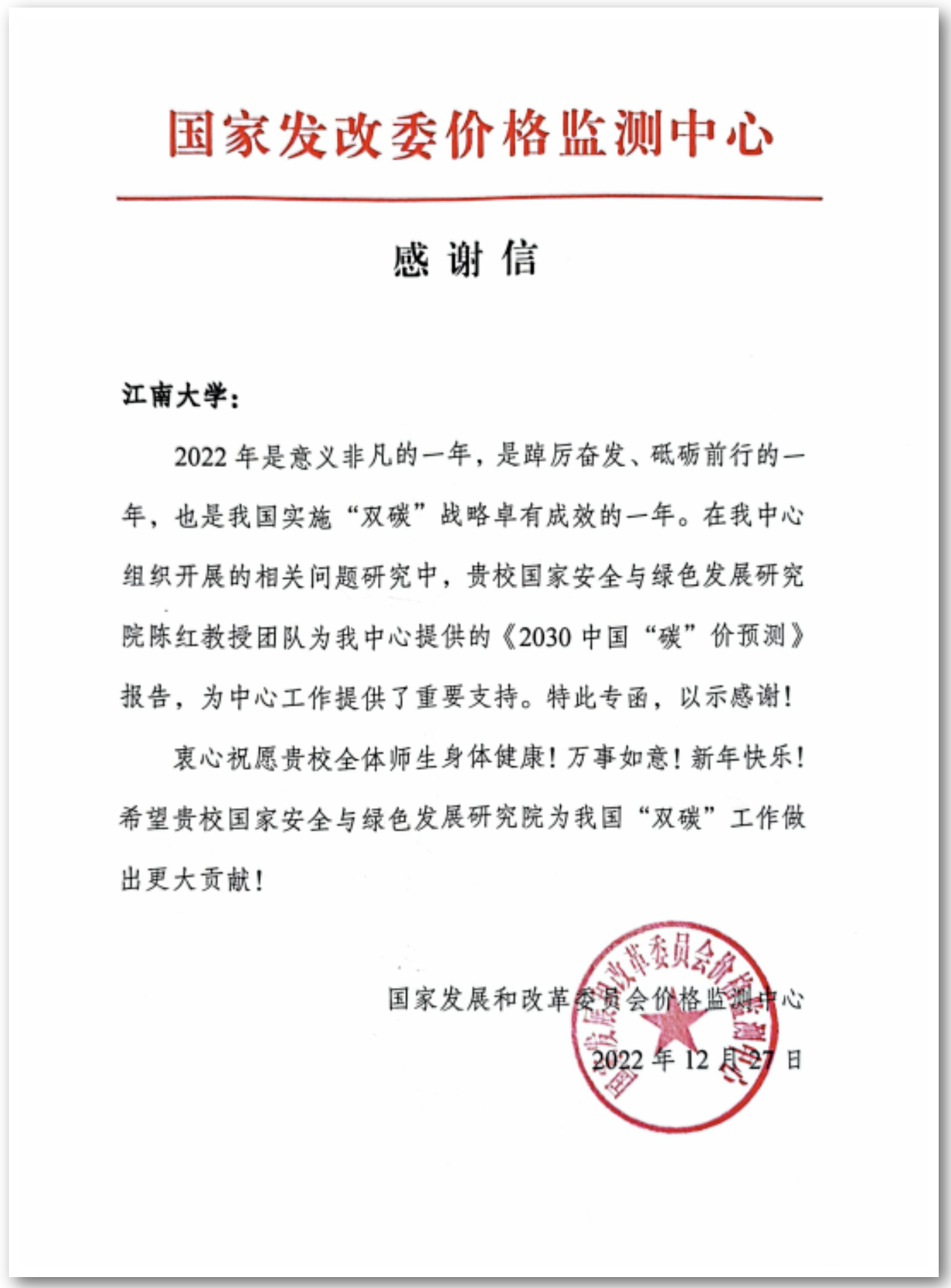 国家安全与绿色发展研究院接到国家发改委价格监测中心商请协助做好碳交易价格研究支持的函,研究院随即组织专班开展专项研究,并于2022年8月6日将《2030中国“碳”价预测》报告提交给国家发改委价格监测中心。2022年12月27日,国家发改委价格监测中心给91制片厂