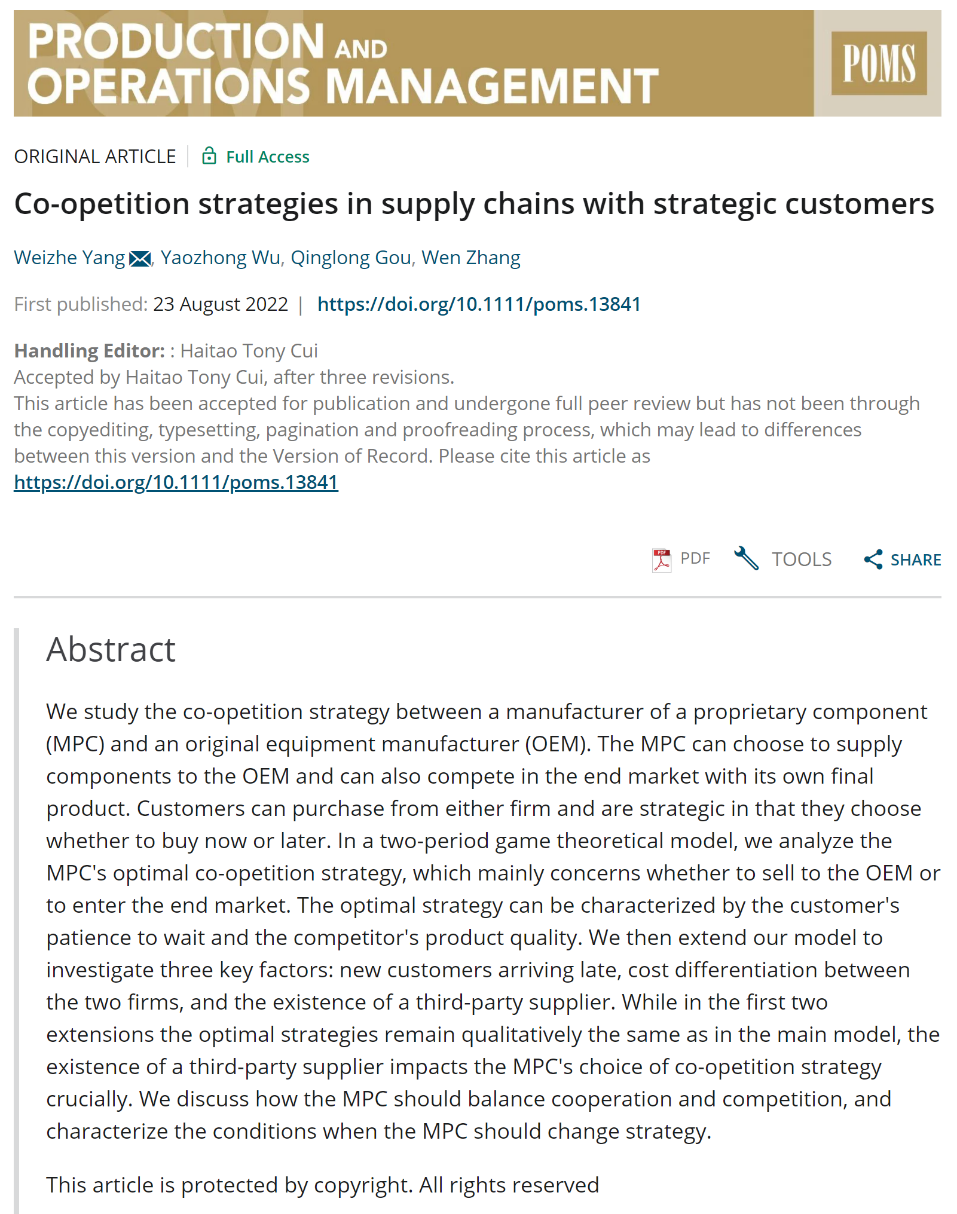 张文博士与中国科学技术大学博士生杨维哲、苟清龙教授以及新加坡国立大学Yaozhong Wu副教授合作的论文“Co-opetition strategies in supply chains with strategic customers”在管理学领域国际顶级期刊《Production and Operations Management》在线发表。Production and Operations Management是美国德克萨斯大学达拉斯分校(University of Texas at Dallas)评定的91制片厂