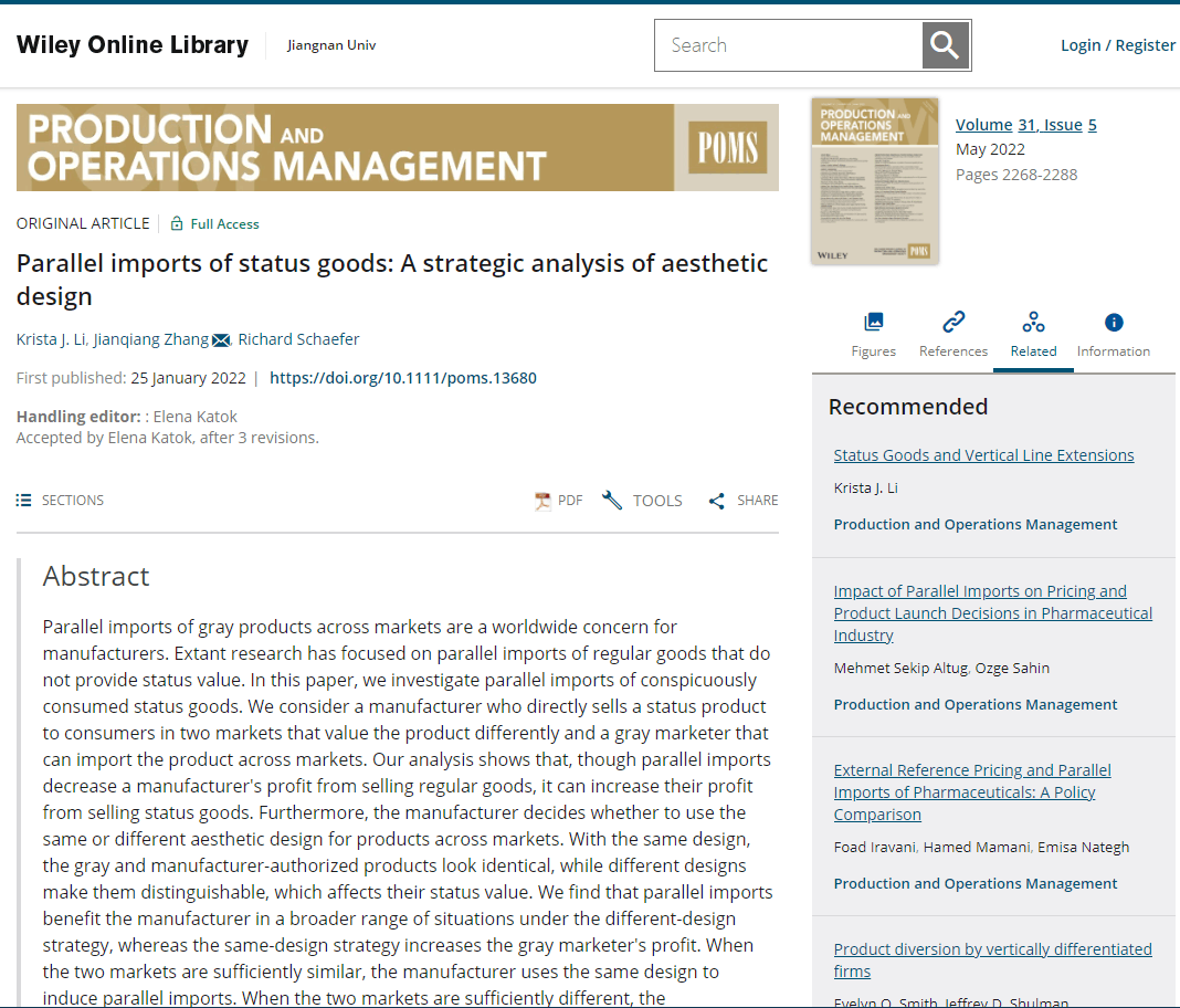 张建强教授与美国印第安纳大学的Krista J. Li副教授和美国罗格斯大学的Richard Schaefer助理教授合作的论文“Parallel imports of status goods: A strategic analysis of aesthetic design”在管理学领域顶级期刊《Production and Operations Management》(简称POM)正式刊出。POM是美国德克萨斯大学达拉斯分校(University of Texas at Dallas)评定的91制片厂
