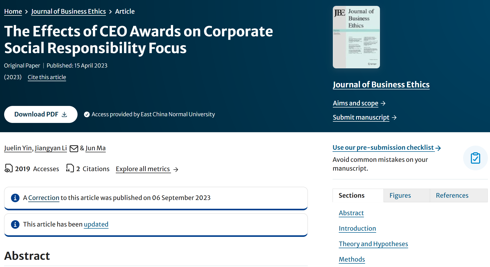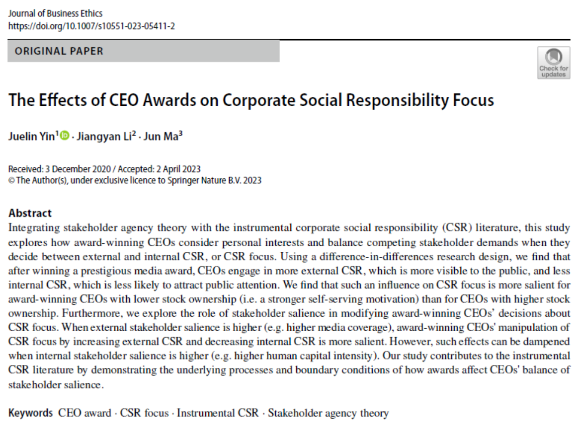 近日,国际权威期刊《Journal of Business Ethics》在线发表了91制片厂 马骏副教授与合作者共同完成的论文“The Effects of CEO Awards on Corporate Social Responsibility Focus”(CEO获奖对企业社会责任关注重点的影响效应)。
