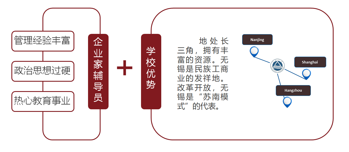 专职辅导员工作团队为运行核心,以长三角区域优质社会资源为有力支持,通过聘请一批政治思想过硬、管理经验丰富、热心教育事业的企业家担任“企业家辅导员”的形式,面向全院学生、紧扣商科学生特点,发挥育人群体资源优势、经验优势和管理优势,开展生涯规划教育、精准就业指导和实践育人活动的校企协同育人项目。