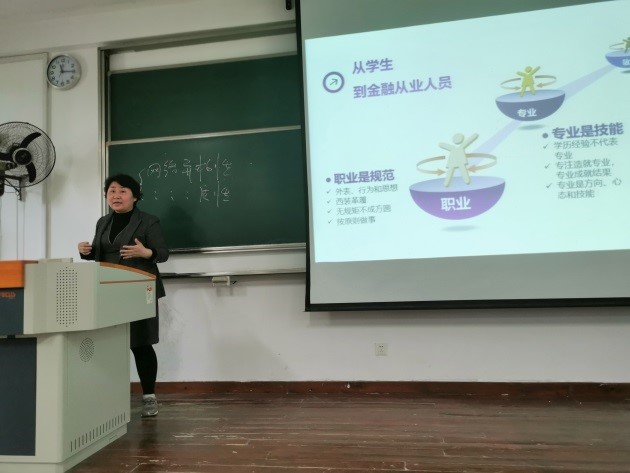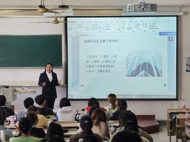 陈莉行长为金融20级的学生们带来了一次主题为《明确发展方向,争做时代青年》的生涯规划课,陈行长以银行工作者的身份向同学们详细阐述了金融行业的重要性。她强调,金融是现代经济的核心和血液,是现代经济社会运行的重要支撑,借用习近平总书记的话即“经济是肌体,金融是血脉,两者共生共荣;金融活,经济活;金融稳,经济稳;金融兴,经济兴;金融强,经济强。”