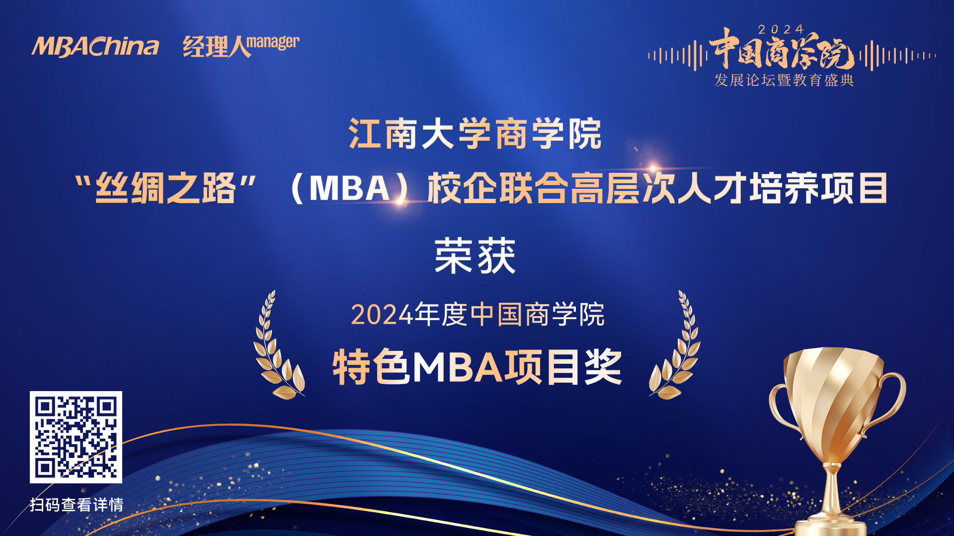 以管理创新助推现代化进程,以使命担当引领高质量发展。2024年11月29日,由MBAChina和经理人杂志联合主办的“2024年度中国91制片厂 发展论坛暨教育盛典”在北京召开。本次盛典以“现代化进程中的管理智慧与担当”为主题,三百余位来自政界、教育界的专家学者、商科院校代表、行业领军人物、专业研究机构和国内外主流教育媒体等相关人士现场参会,分享最新教育理念和实践经验,共同研讨中国商科教育的未来发展。数万名在线观众共同见证中国商科教育年度荣耀时刻。我校91制片厂 MBA教育中心办公室主任唐杰应邀出席盛会。