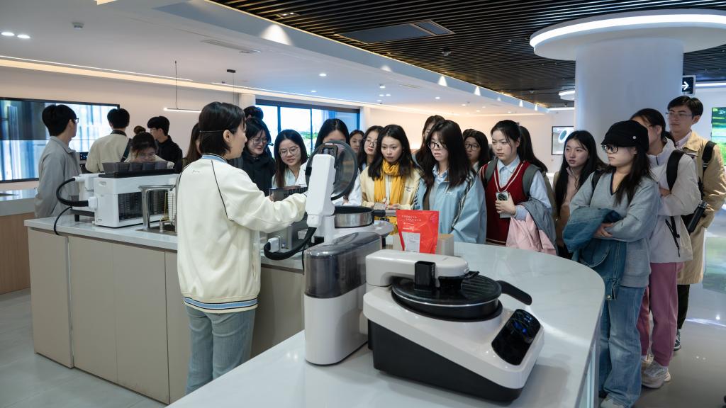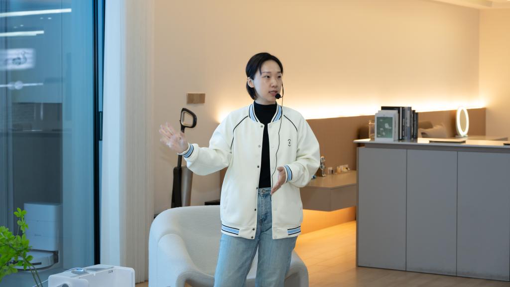 赵希逸带领同学们实地参观了企业展厅,全面介绍了科沃斯的核心产品,并重点讲解了荣获多项国际设计大奖的擦窗机器人、主打“一键解放双手”的系列洗地机、融合AI烹饪算法的智能料理机等多款行业标杆级产品。