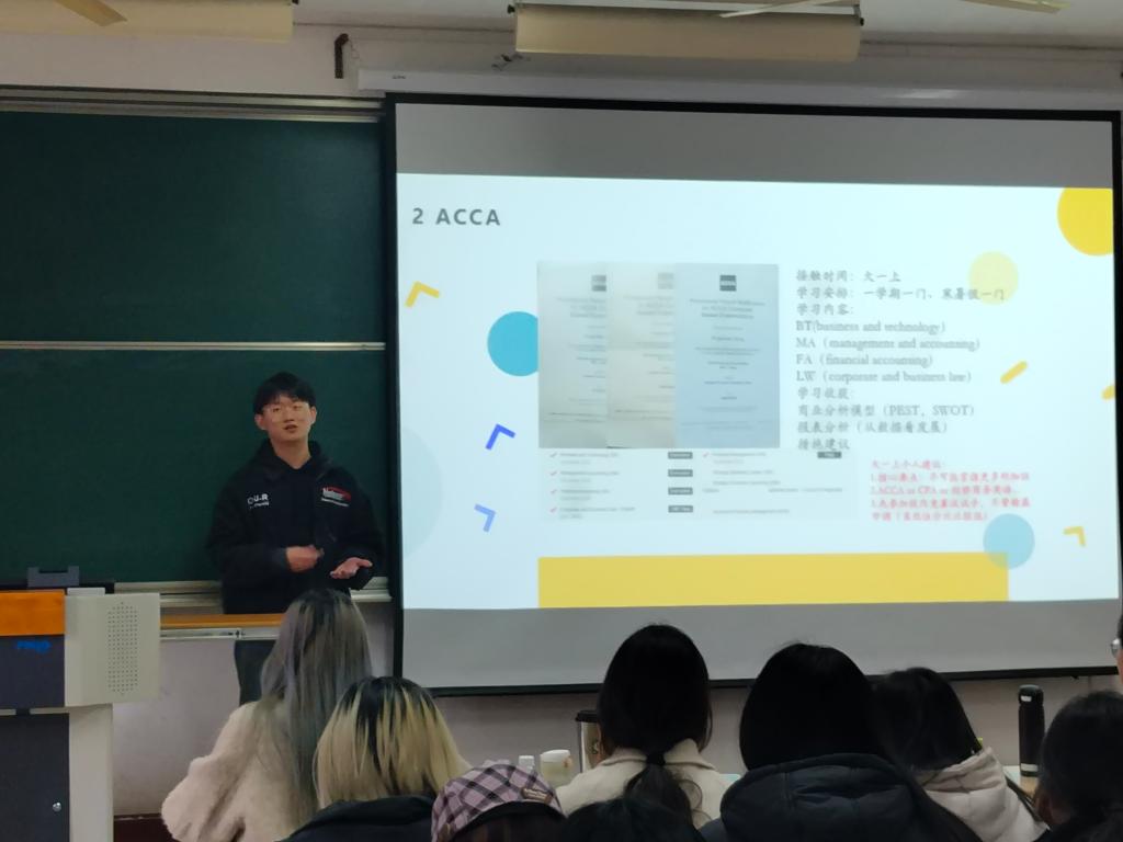 曾致纯同学结合自身丰富的经历,通过一道商赛小组挑战题目的讲解来引出话题,让同学们对商赛的流程以及其所要具备的技能有了一定的了解。她以大一同学对赛事的选择及证书获取为出发点,从实训的实际运用、商赛技能储备、面试加分经历等多方面对同学们进行了专业上的指导,提出了学习ACCA的优势及作用,强调了切实合理地选择的重要性,鼓励同学们多方向发展自己,充实大学生活。