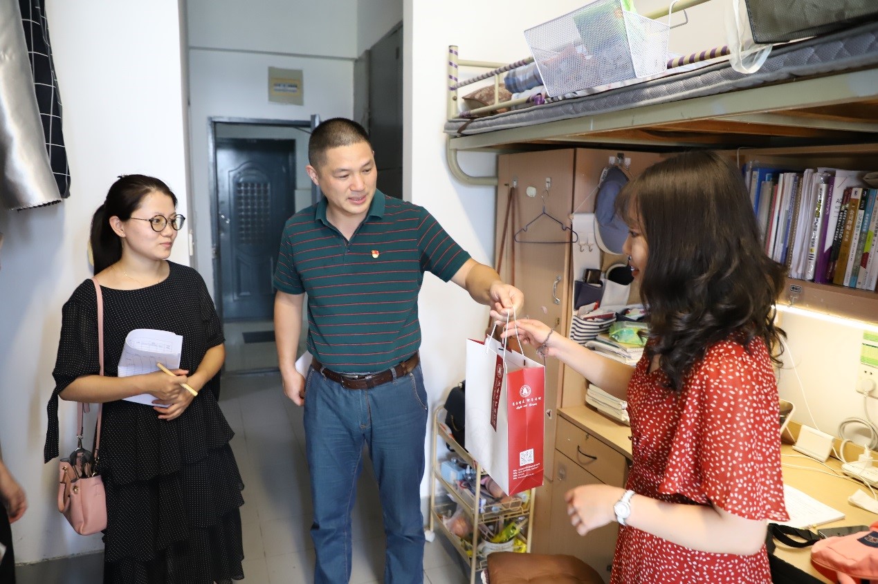 在宿舍走访过程中,张海峰书记还真切关注湖北、新疆同学疫情期间的生活状况,对同学积极参与抗疫行动和坚持刻苦学习的精神给予肯定。工业1802的程妮来自湖北武汉,她表示刚刚带着期待与惦念返回校园,就收到了老师们亲自送来的鼓励与慰问,倍感安心与暖心。金融1802的开比努尔·艾则孜来自新疆和田,学院细致周到、亲切有序的返校安排令她对新学期充满期待,她表示将迅速调节心态,不辜负学校领导和老师的关心和关爱。