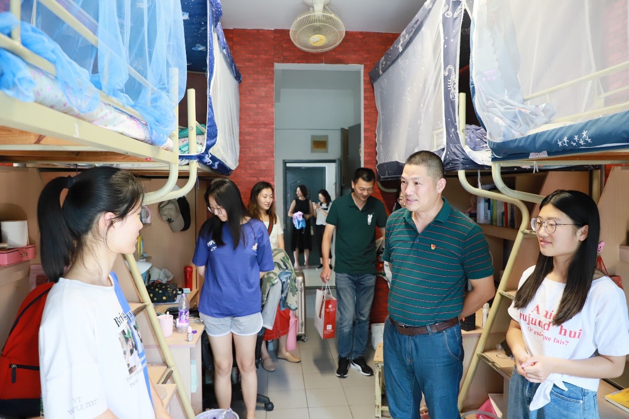 “你的家乡是哪里的?”“回到学校吃的住的还习惯吗?”“对学校采取的防控措施都理解吗?”在走访的每个学生宿舍,学院领导老师与学生亲切交谈,详细询问返校过程、居家在线及返校后的学习情况,了解学生宿舍卫生、消毒和通风情况。