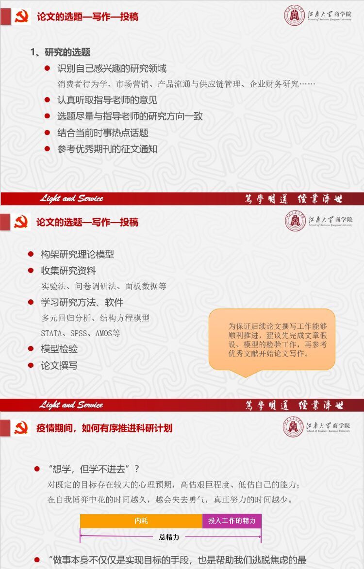 管理学科本科生第二党支部的苏锦杰、管理学科本科生第一党支部的韦雅丽、19硕第一党支部的布玉婷分别以“努力着,等待奇迹的到来”、“梦在远方,应当远行”、“正是江南好风景”为主题讲述本期微党课,对保研专业选择及考试方法,大学实习选择、学术研究兴趣培养与论文撰写技巧进行了深入剖析,分享了属于他们的“逐梦青春”与“使命担当”。