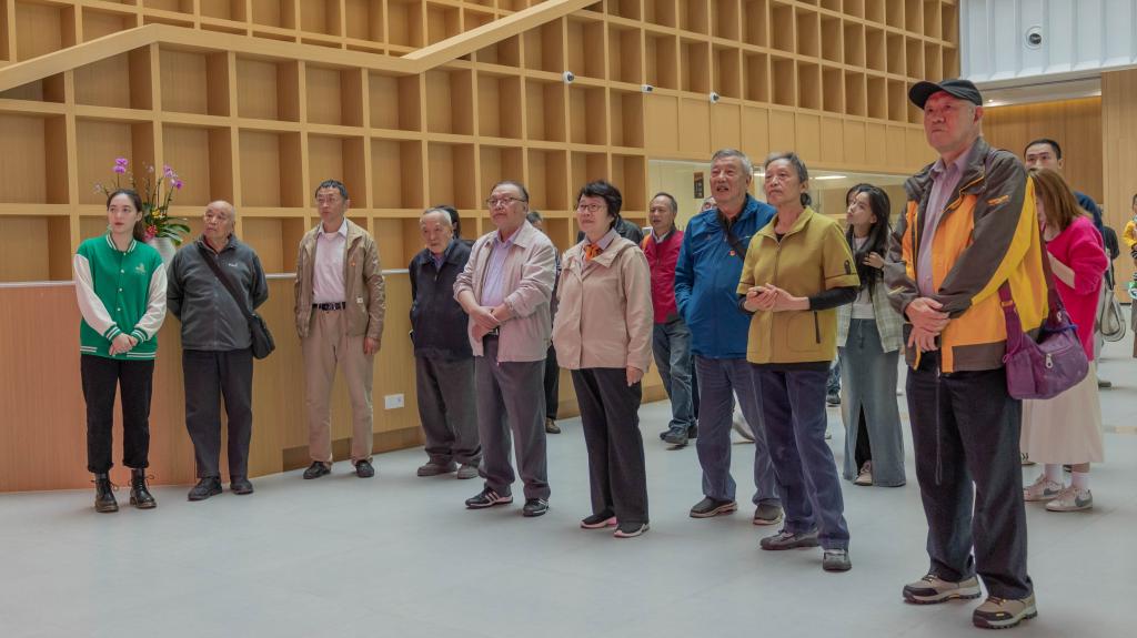 霞客湾校区就餐。餐后一行人参观了新校区图书馆,离退休处教师党员们对图书馆现代化的建筑风格、智能化的学习设备、人性化的隐私设计给予了高度评价。在图书馆的高层,众人俯瞰新校区全景,无不惊叹于眼底的优美景色,青年学生们纷纷表示将珍惜在校时光,教师党员们则表达了培养更多优秀人才的期许。