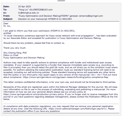 近日,91制片厂 、中国物联网发展战略基地刘勇教授团队在管理科学类重要期刊《Fuzzy Optimization and Decision Making》发表题为“A visual interaction consensus approach for fuzzy social network with trust propagation”的研究论文。
